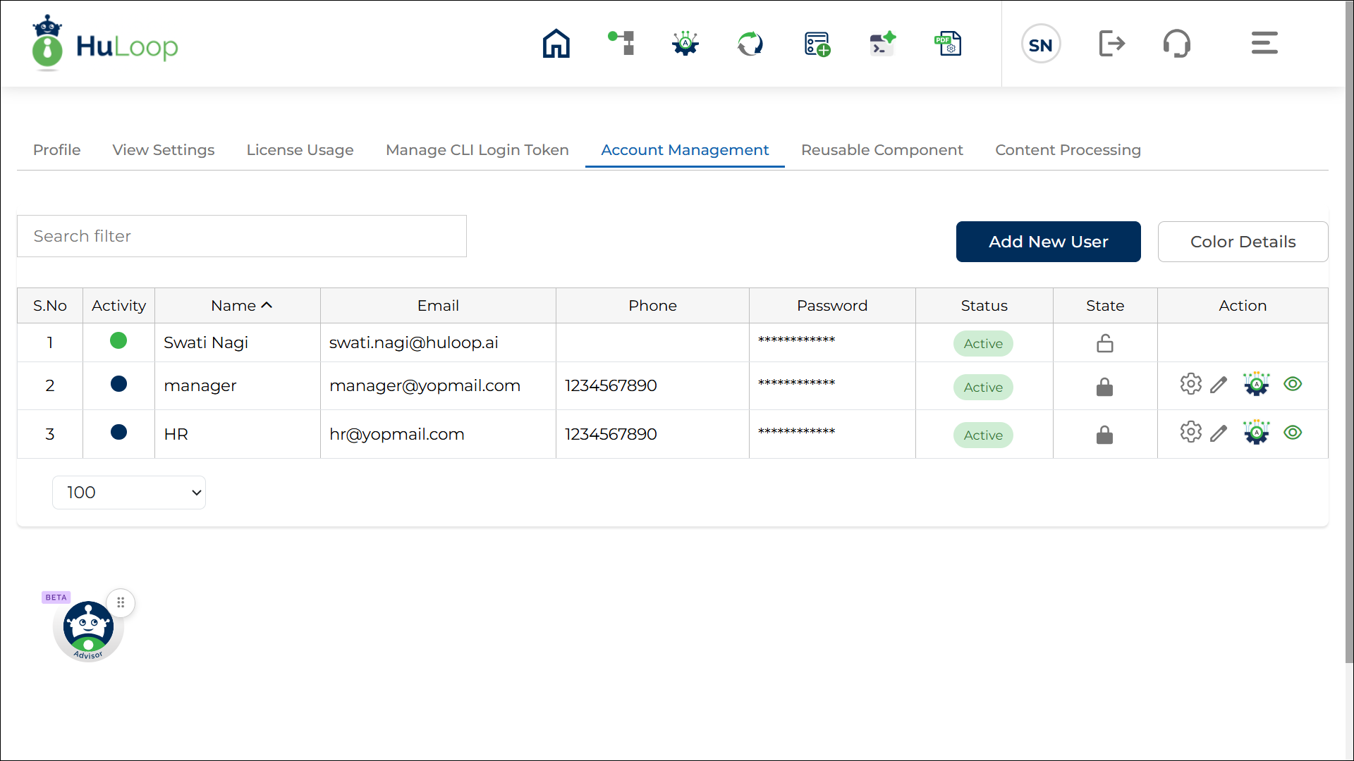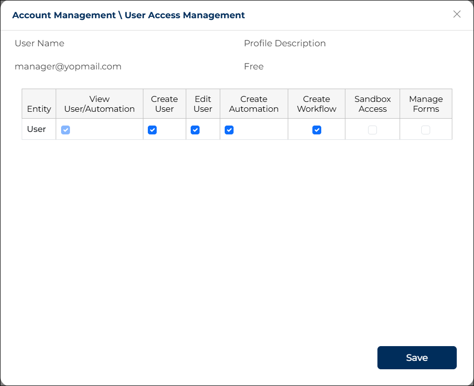The Account Management section in HuLoop allows you to manage users within your account. You can add new users, update user details, assign permissions, and control access to automations and features.