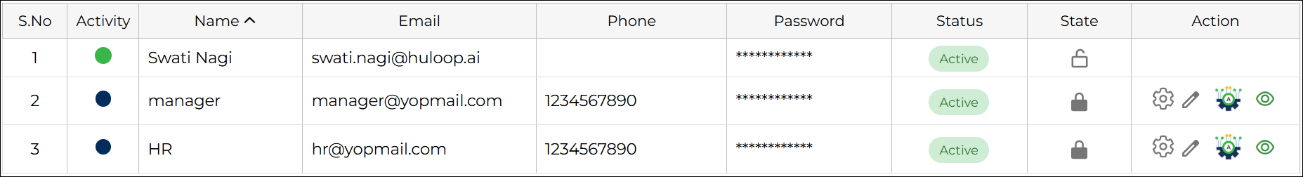 Each user has multiple action options available in the Actions column.