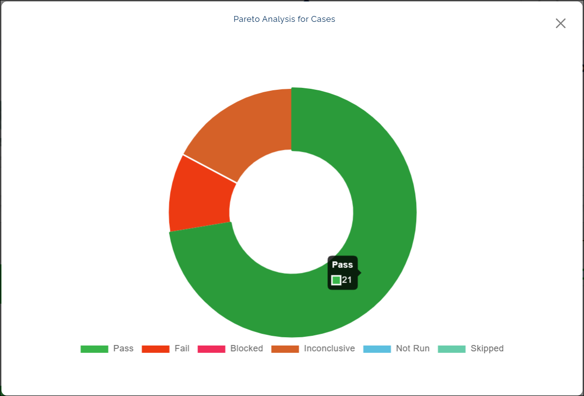 • The Pareto Analysis for Cases chart displays the outcome of your automation runs, categorized by status: Passed, Failed, Blocked, Inconclusive, Not Run, and Skipped.
