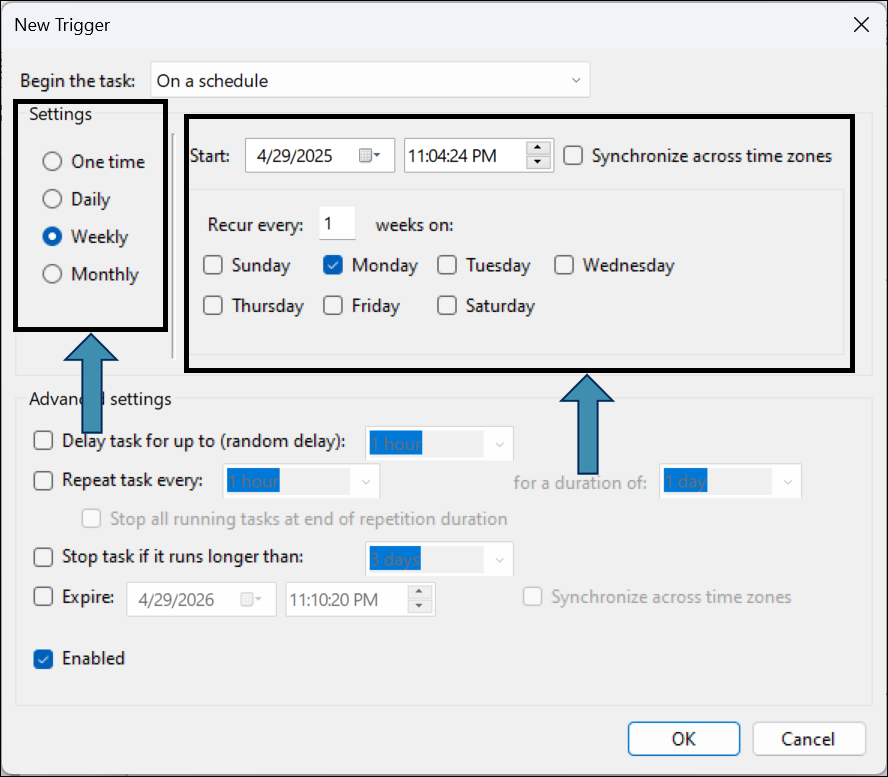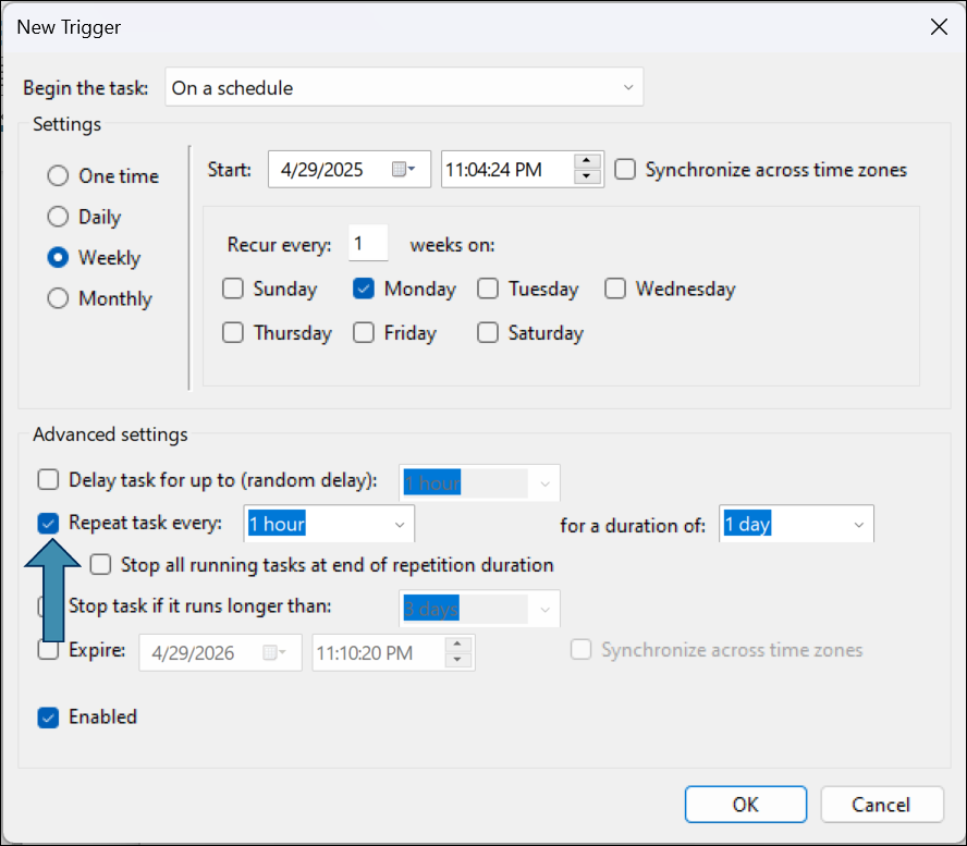 - Under Advanced settings, check Repeat task every and define the repeat interval (e.g., every 1 hour).