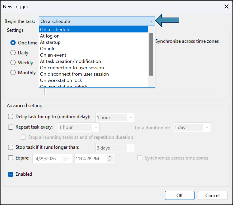 Enable Synchronize across time zones if your machine or scheduled task needs to run at a consistent local time, regardless of time zone differences. This is especially useful if the automation will run on machines in different regions or if the system time may vary.