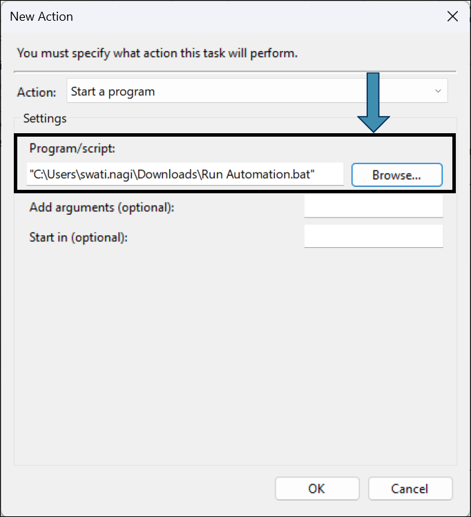 - Click Browse and select your batch file created earlier.