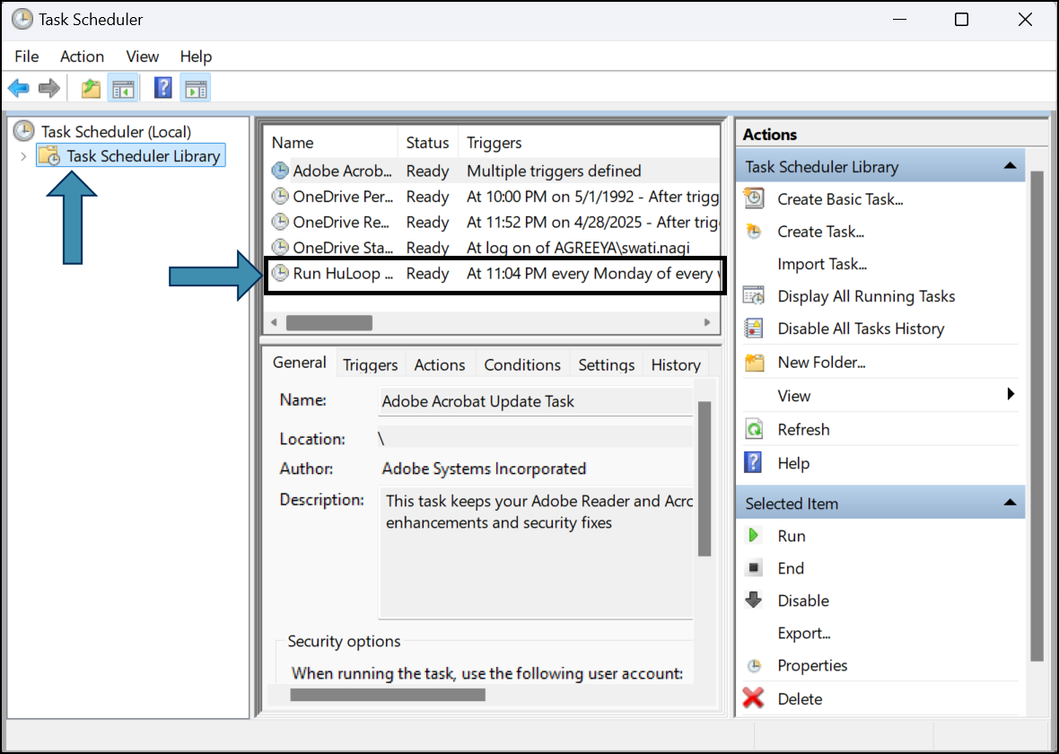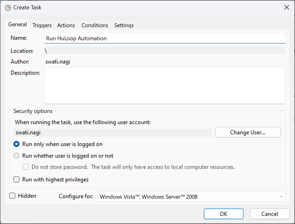 - In the General tab, name the task (e.g., Run HuLoop Automation).
