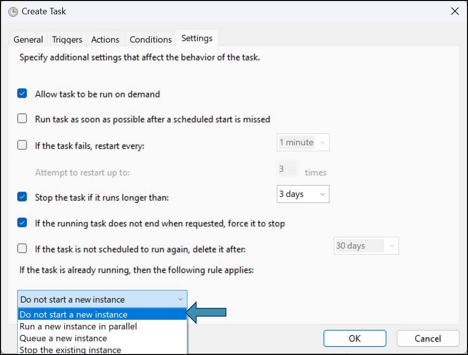 - Set how the task should behave if it’s already running: You can choose an execution rule to define what happens if a previous instance is still running.