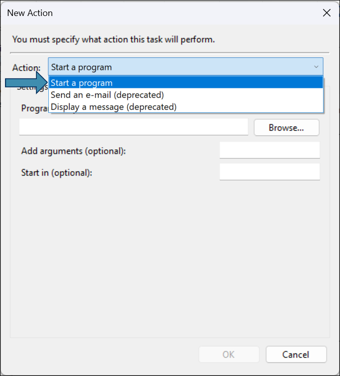 - Select the Action as Start a program (if not already selected).