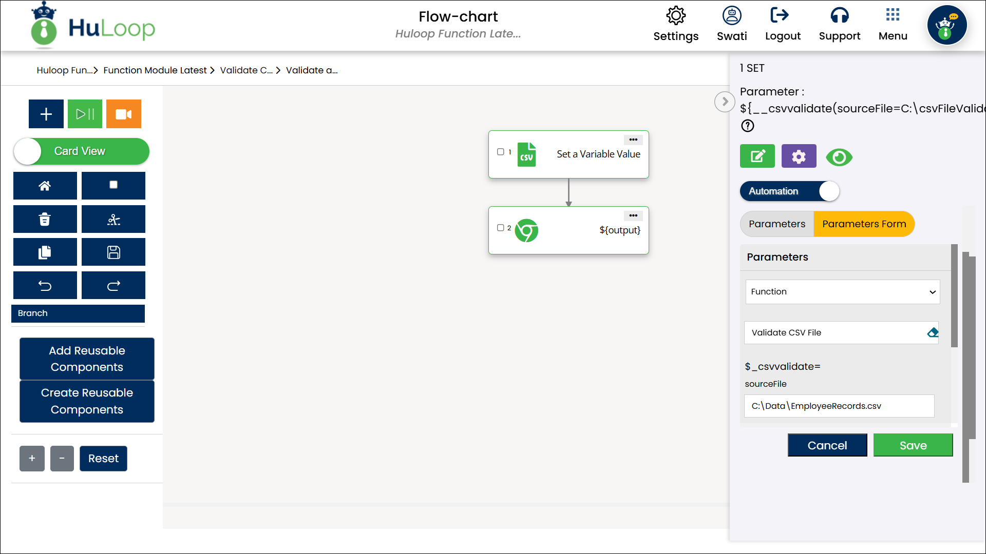 The Validate CSV File function is used to compare the data in a source CSV file against a validation file. The discrepancies, if any, are recorded in a destination file. This function helps identify mismatches or inconsistencies between two CSV files, ensuring data accuracy in automation workflows.