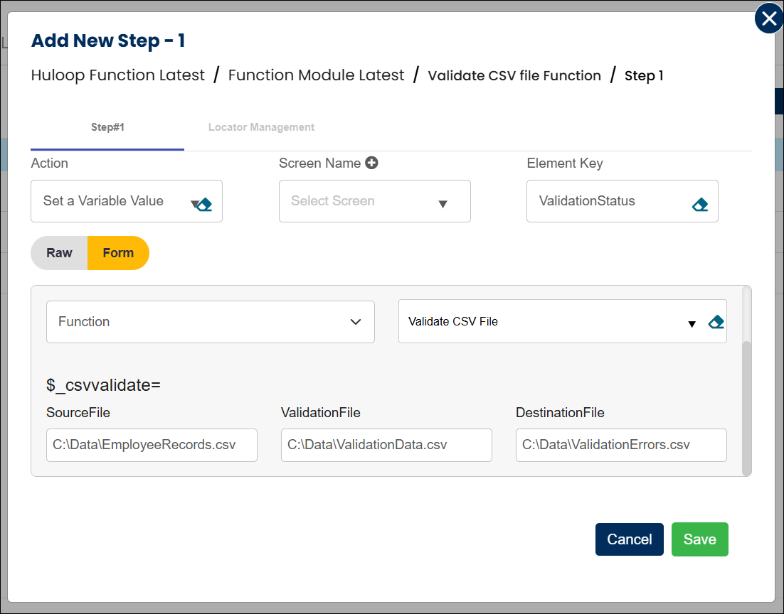 Example: Suppose you have a source CSV file, EmployeeRecords.csv, and a validation file, ValidationData.csv, located at C:Data. You want to compare these files and save any discrepancies in a new file named ValidationErrors.csv.