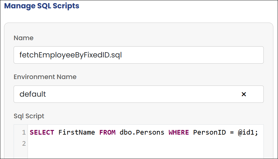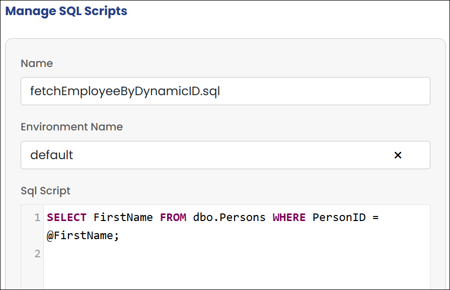 - If using a default database, enter only the script name (e.g., Get_Employee_Details_Script).