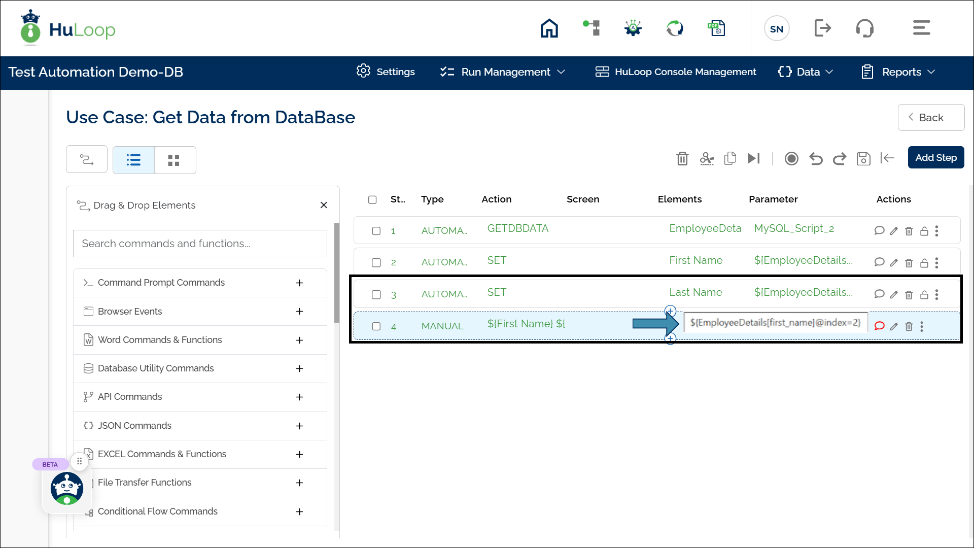 HuLoop allows you to use SQL scripts in automation cases through Functions and Actions:
