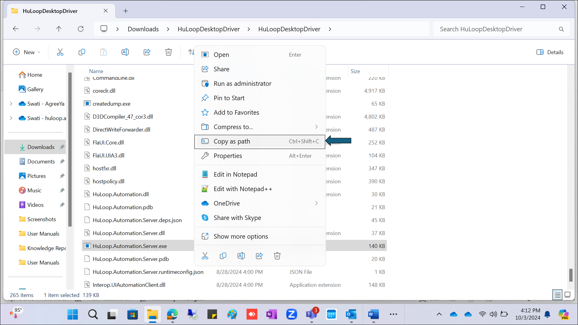- Open the HuLoop Driver folder and copy path of the .exe file (e.g., HuLoop.Automation.Server.exe).