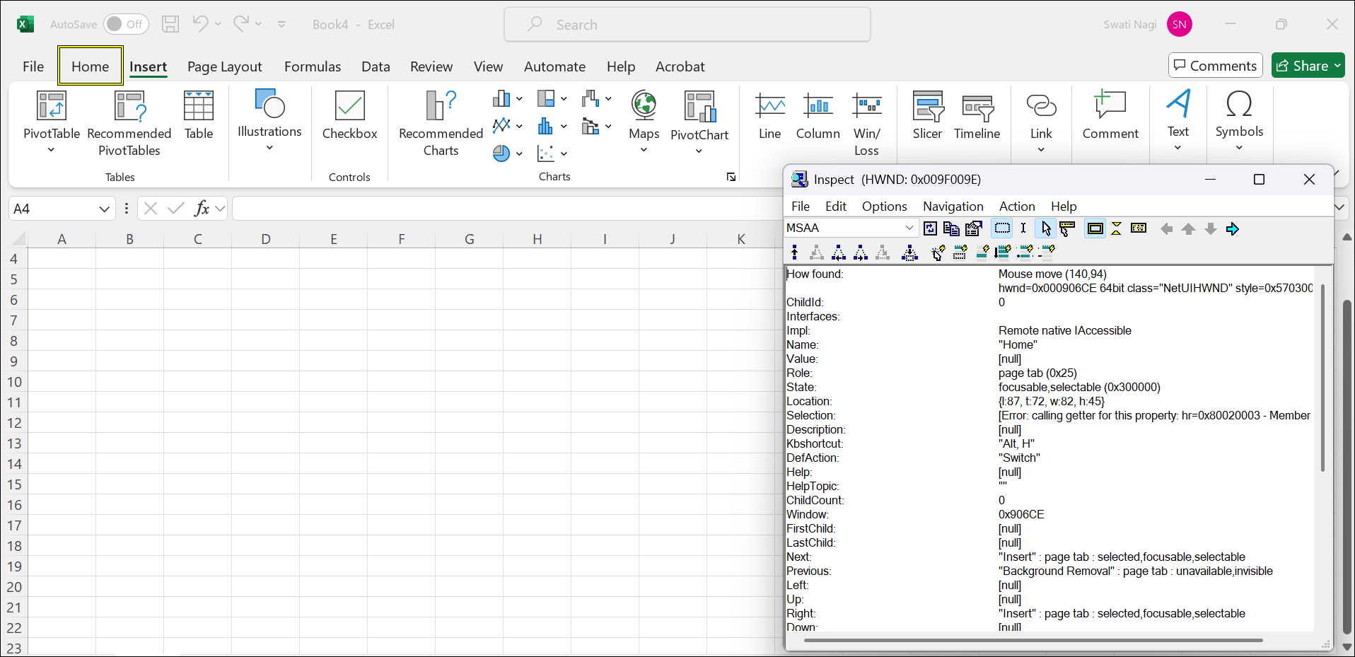 - Hover over the element you want to identify (e.g., the Home tab in Excel). The tool will highlight the selected element.