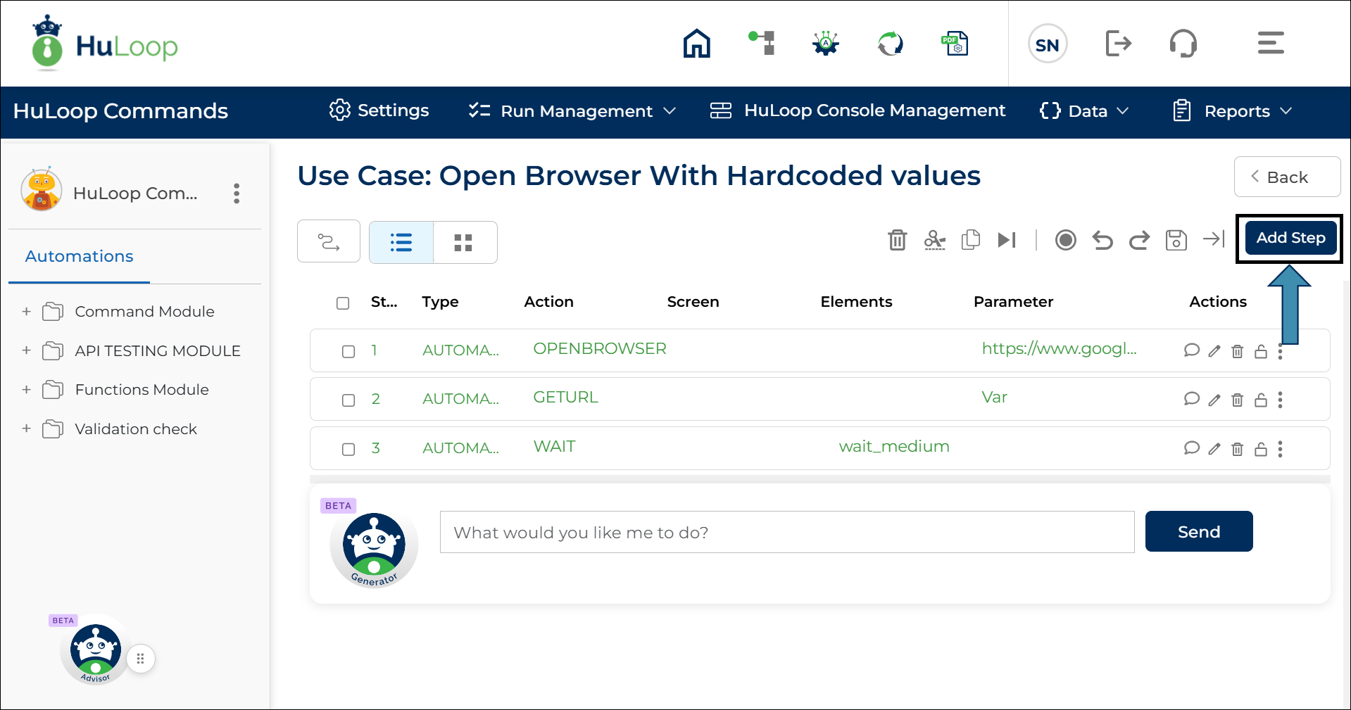 Adding steps to Cases allows you to build or modify your Case to automate tasks. Each step performs a specific action that can be customized by selecting commands and defining parameters.