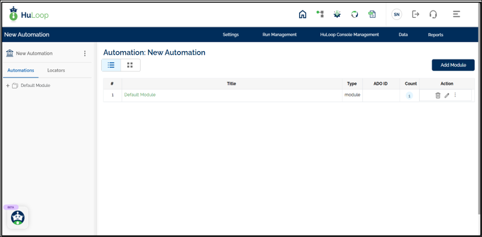 - After saving, HuLoop opens your newly created automation. You’ll see a default module, which contains a default suite and a default case. You can edit these defaults to match your requirements or add new modules, suites, and cases as needed.