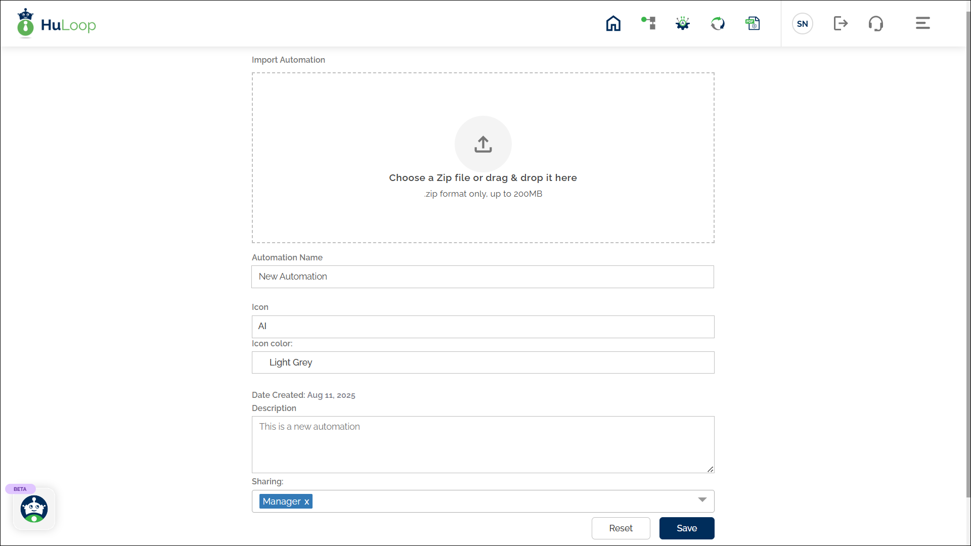 By default, the automation icon is set to the AI industry icon. You can change it to a HuLoop bot icon or choose a different industry icon, such as Banking or Healthcare. If you select an industry icon, you can also customize its color.