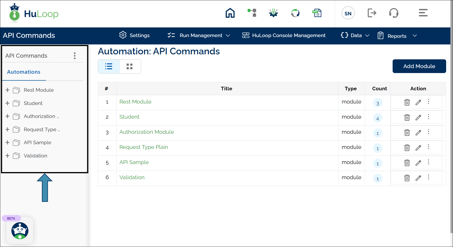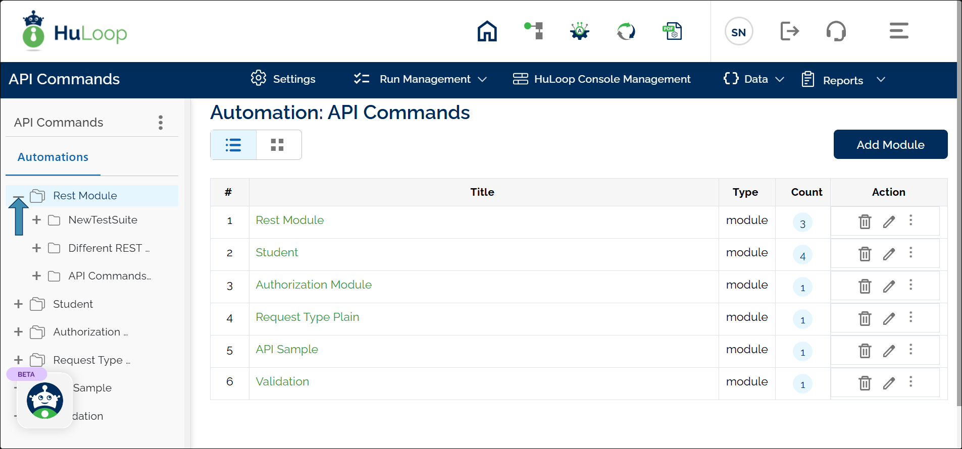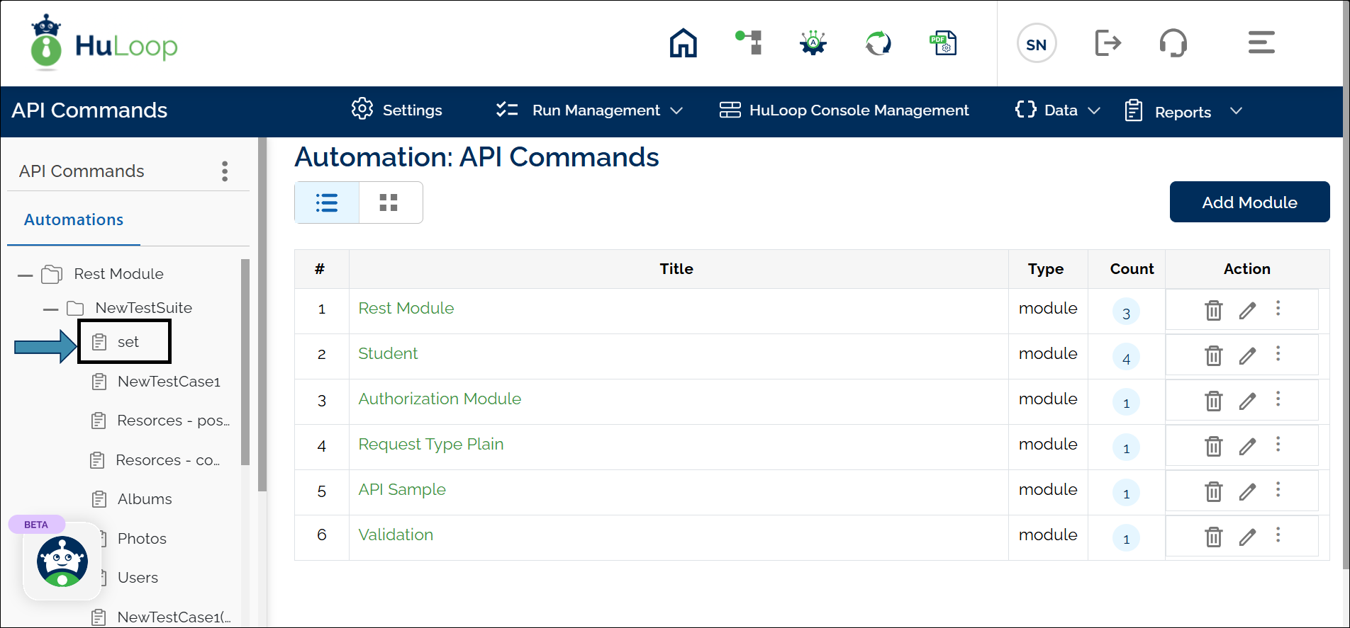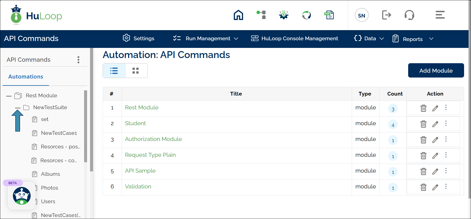 - To view Suites, select the corresponding module title (e.g., Rest Module).