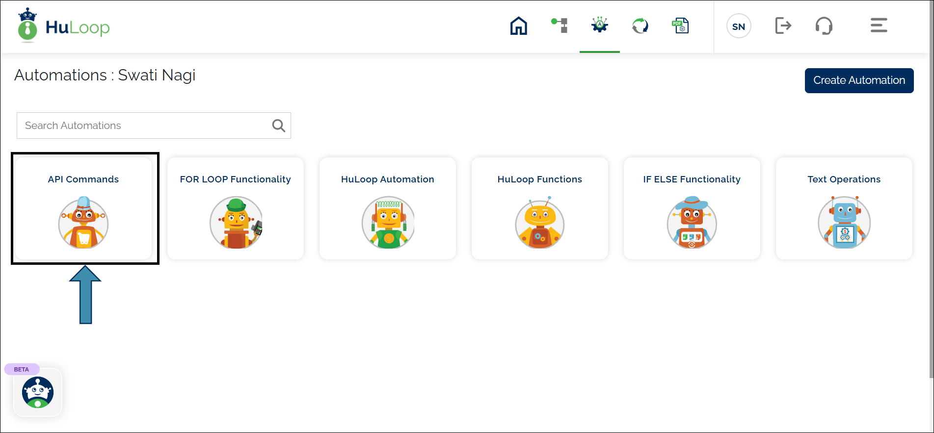 - Open the automation project where you want to work on (e.g., API Commands) by clicking anywhere on its card.