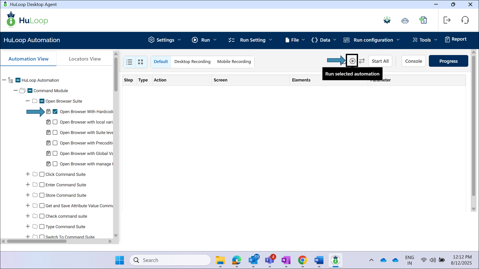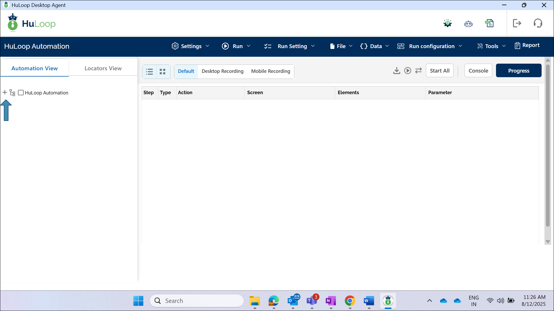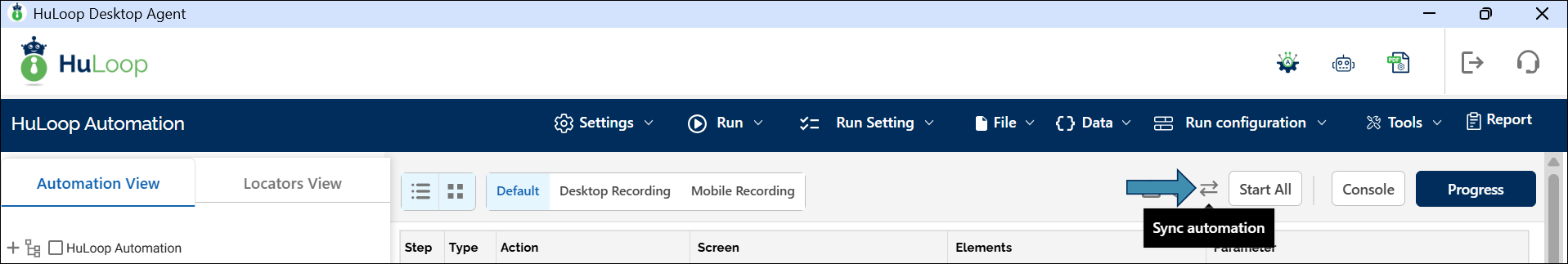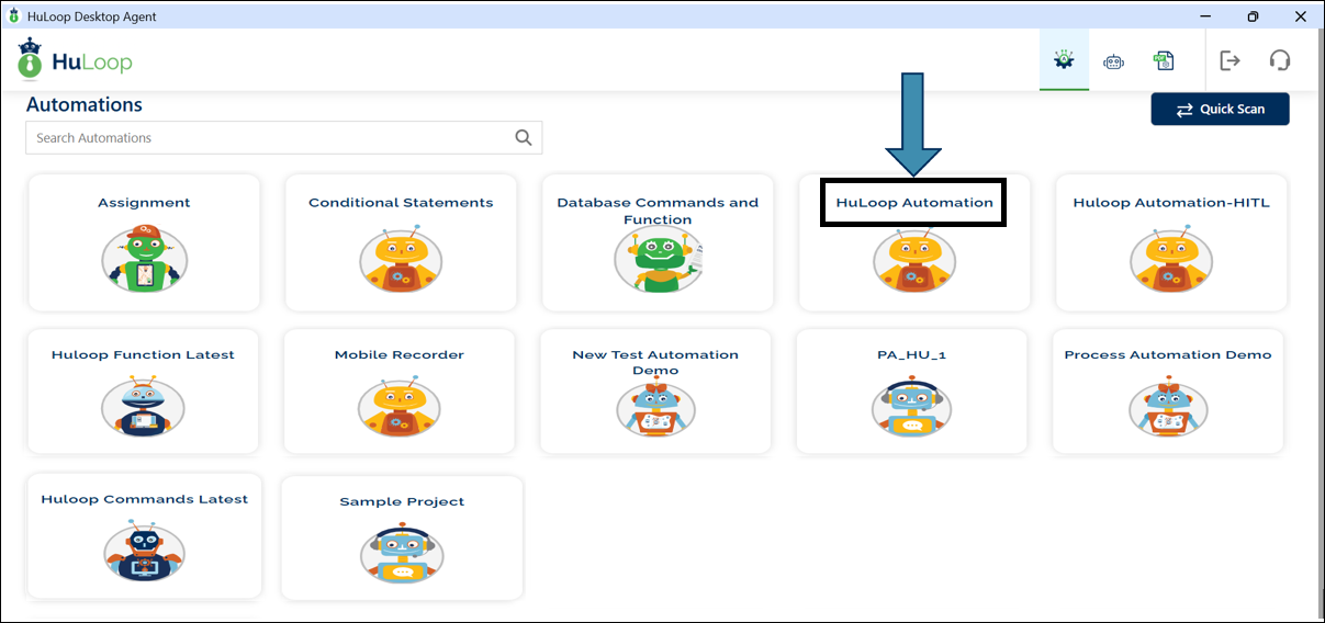 - Whenever you want to switch to a different automation project on the Agent, click on HuLoop at the top left of the screen to refresh the Agent.