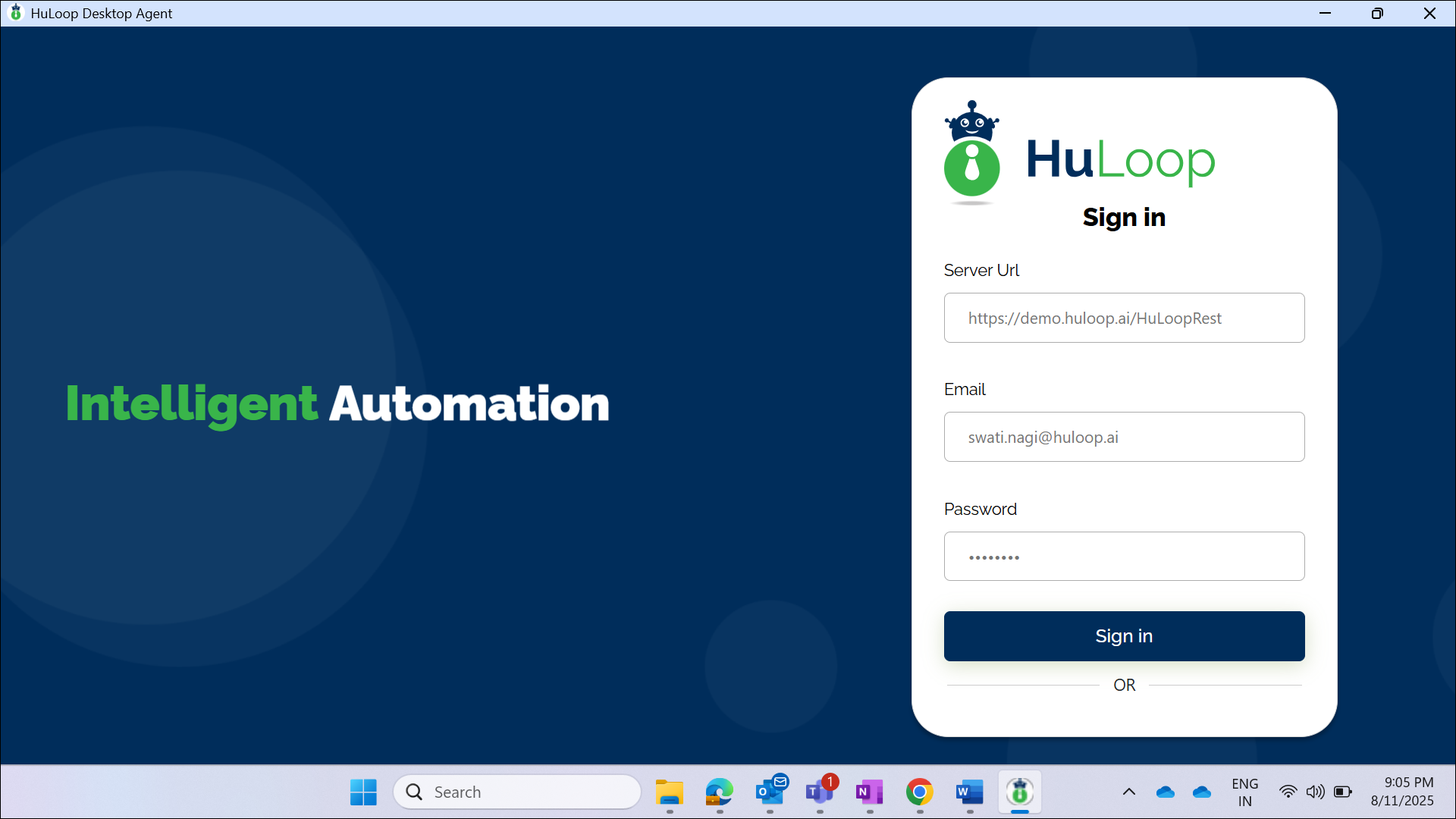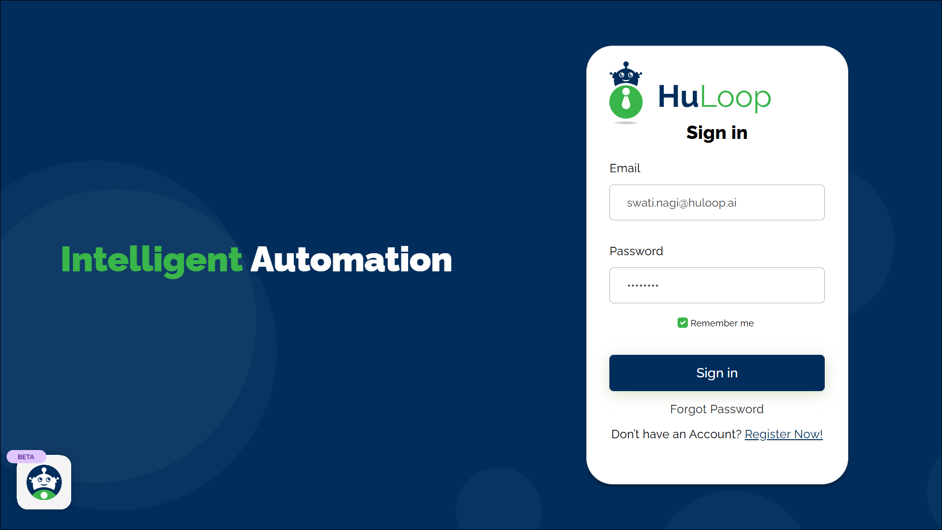 - Enter your HuLoop email ID i.e., username@huloop.ai and password in the respective fields and click Sign In.