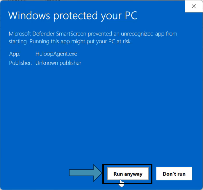 - You will get another pop-up, as shown. Click Run Anyway to run the downloaded application (HuLoop Agent).