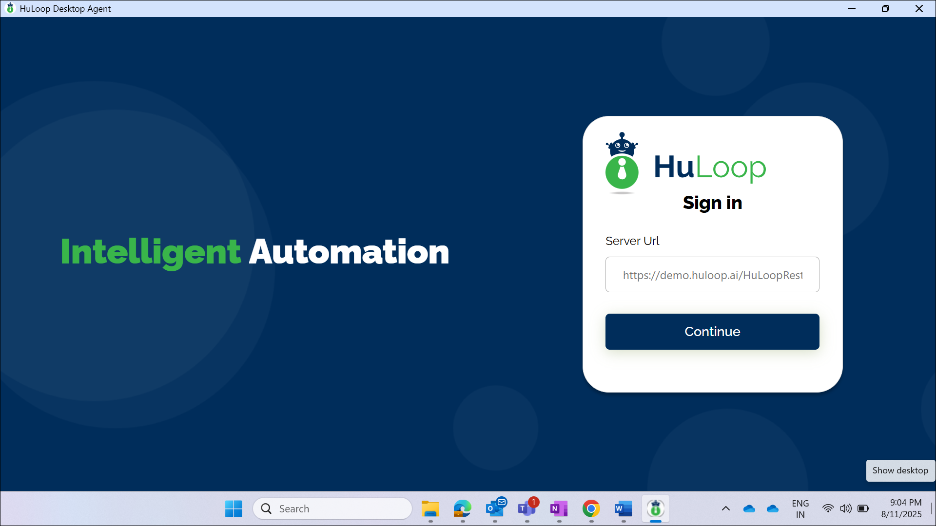 - On successful installation, the following screen will appear where you should enter your HuLoop server URL to be used in the Agent and click Continue.
