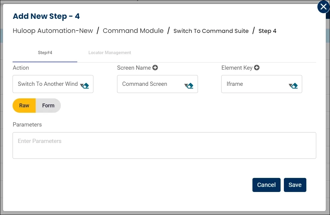 - Select Switch To Another Window/Iframe from the Action drop-down.