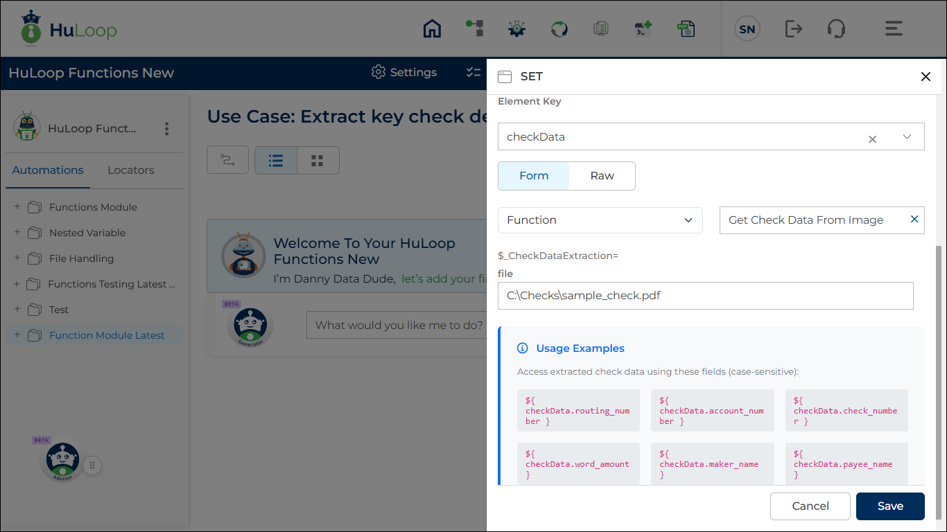When this function runs, HuLoop reads the check file and extracts important financial information such as routing number, account number, check number, amount in words, maker name, and payee name. All extracted data is stored in a variable for use in later automation steps.