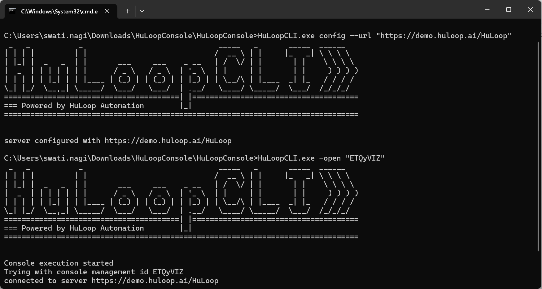 HuLoopCLI.exe<space>-open<space>”<Console Run ID>”