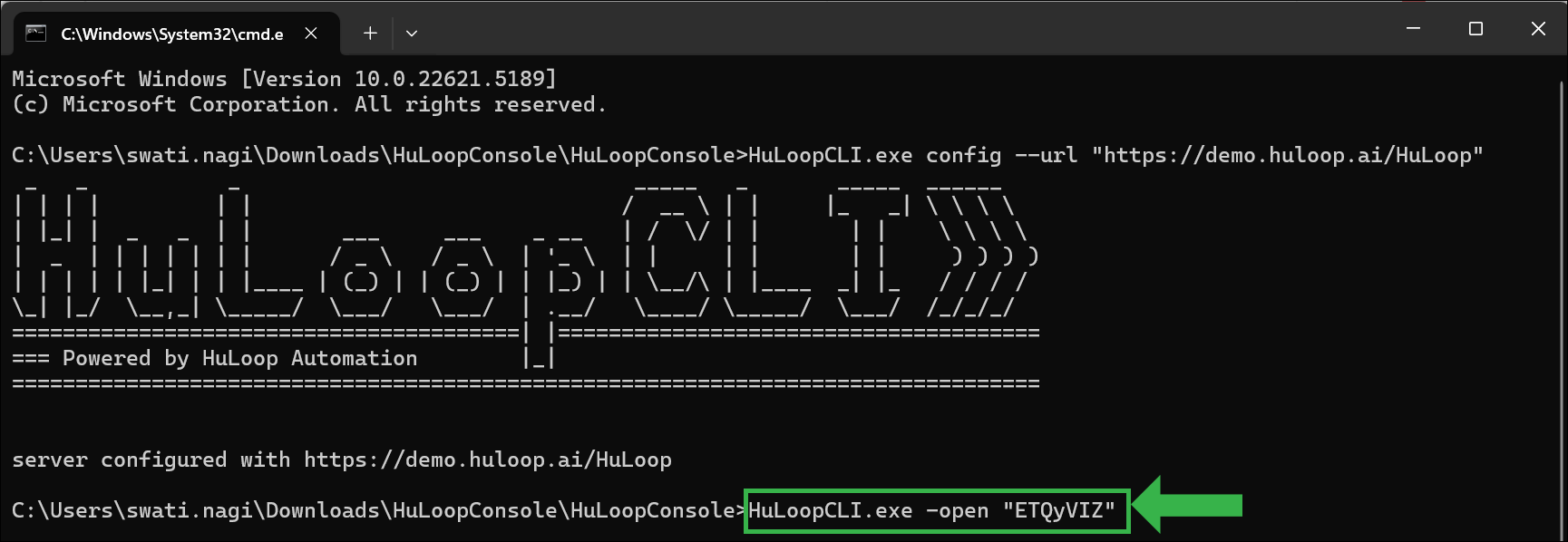 e.g., HuLoopCLI.exe -open “ETQyVIZ”