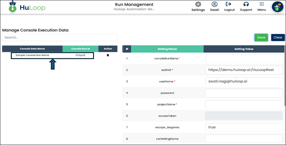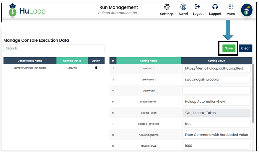 To trigger an execution from the command line, you need to create Console Execution id. This includes key details like the project name, Run Setting, and report preferences that the CLI tool will use during execution. Follow these steps to create Console Execution id: