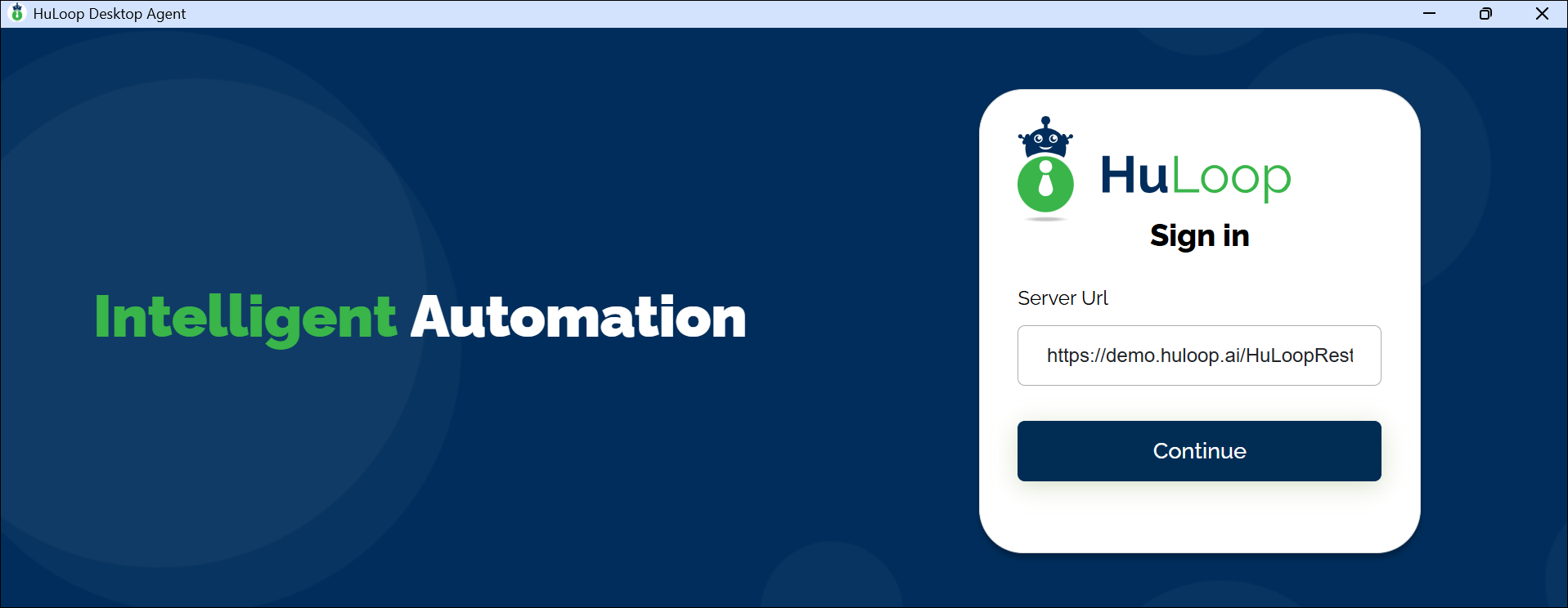 - On successful installation, the following screen will appear where you should enter your HuLoop server URL to be used in the Agent and click Continue.