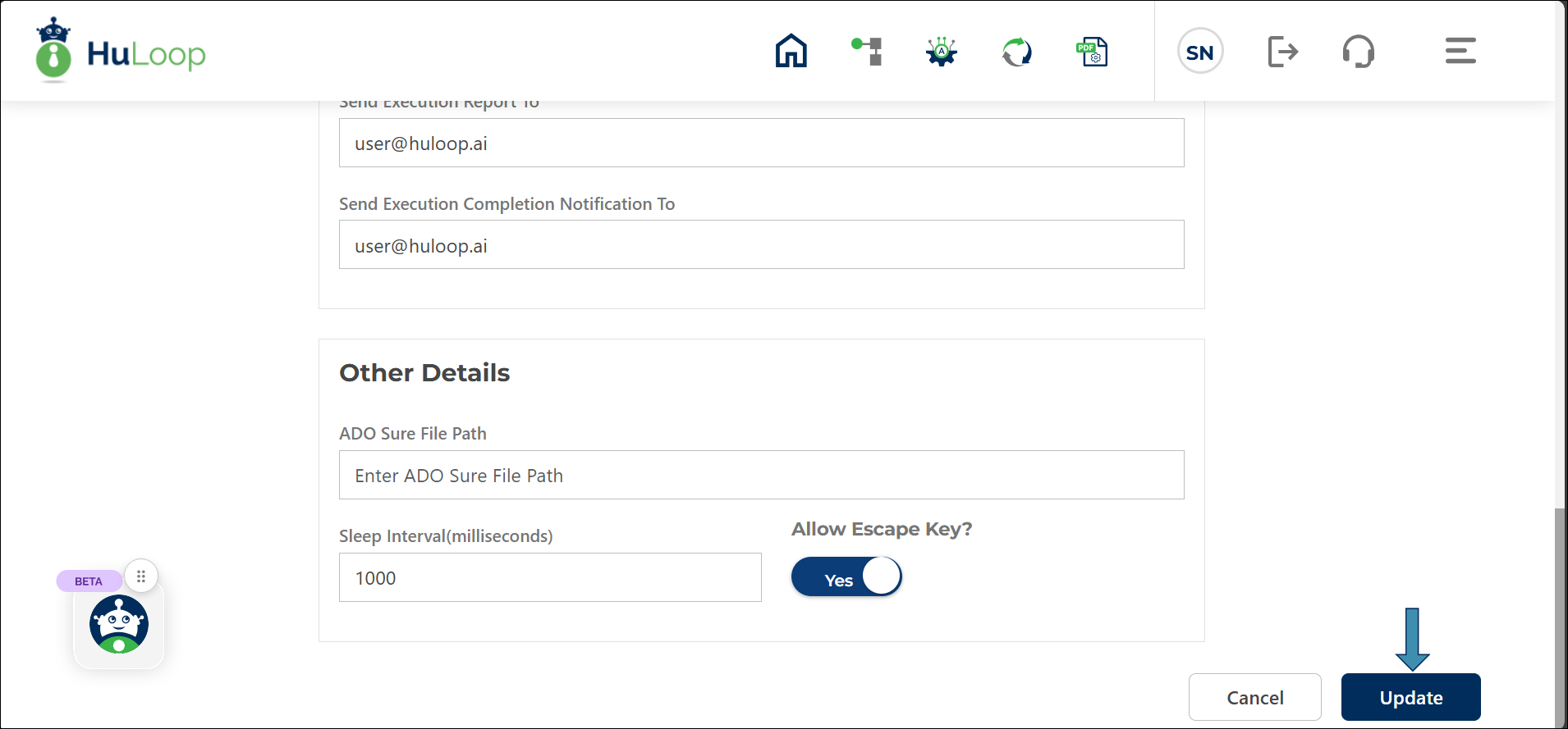 | Email Notifications | Send Execution Reports To, Send Execution Completion Notification To | Update or add comma-separated email IDs to change report or notification recipients. |