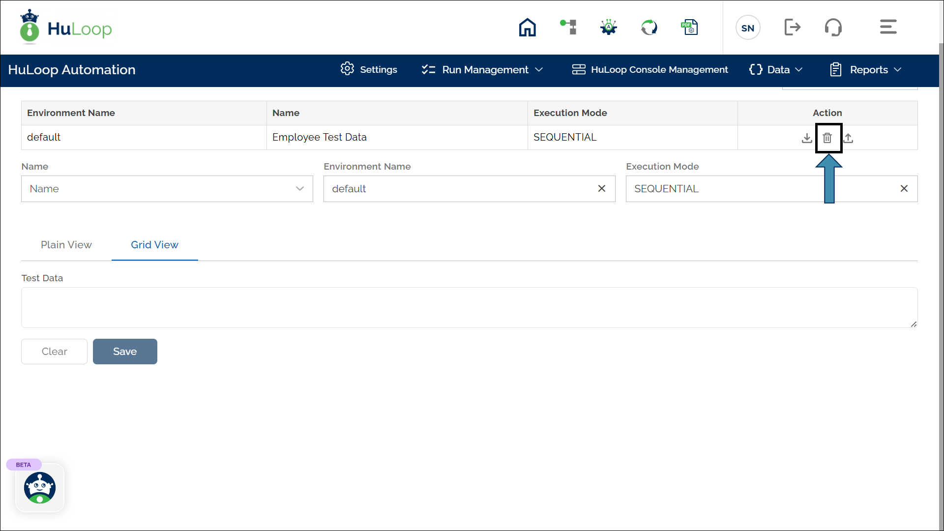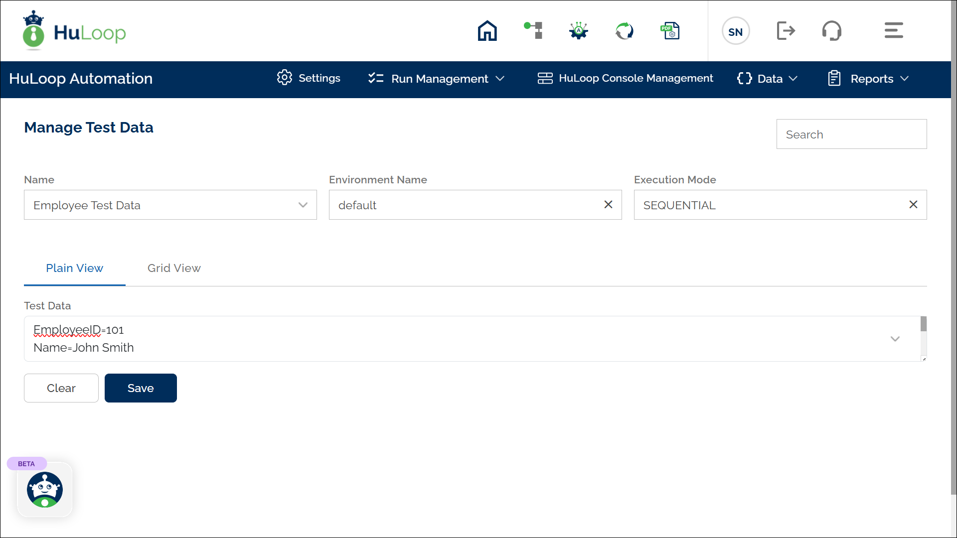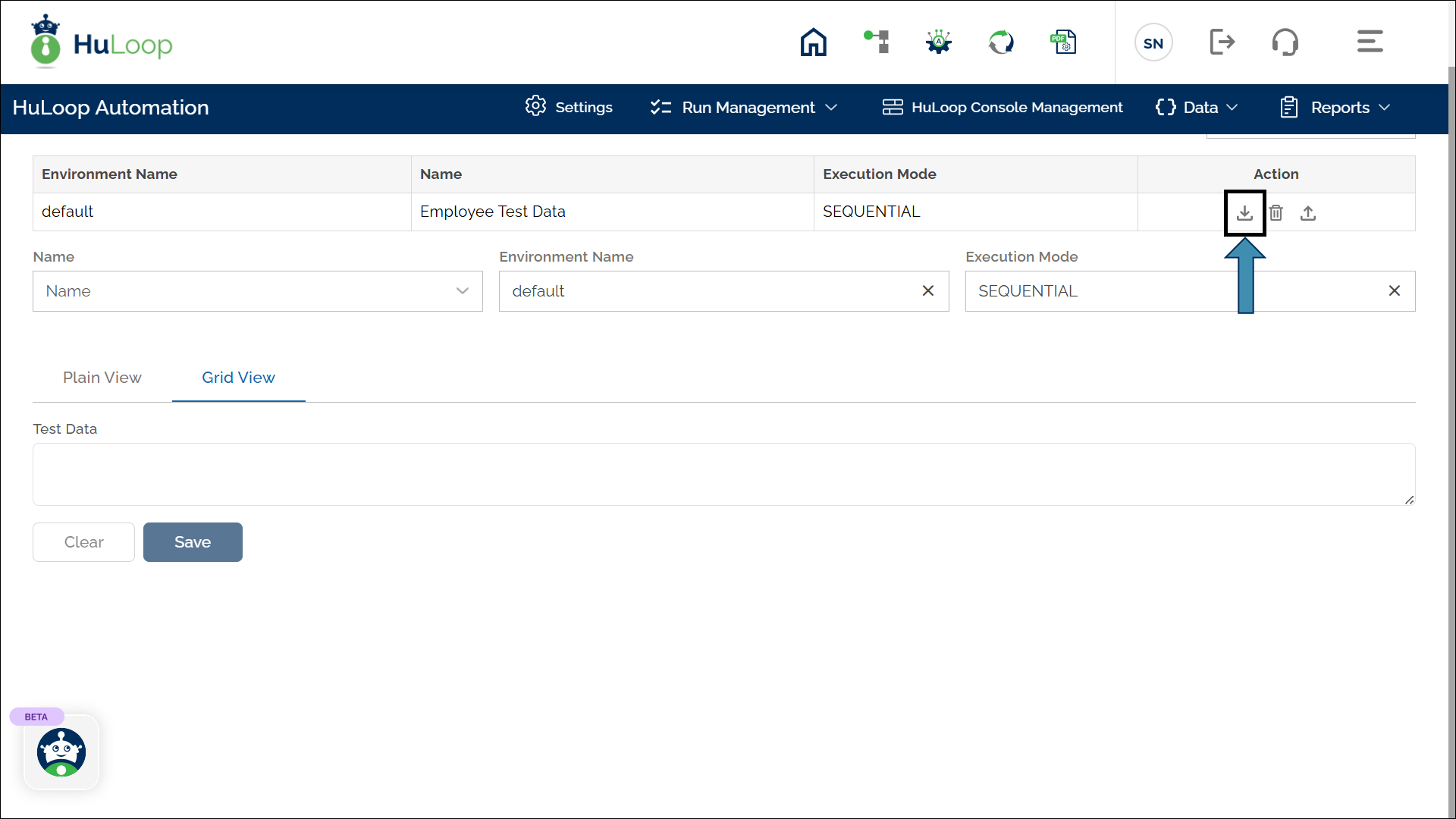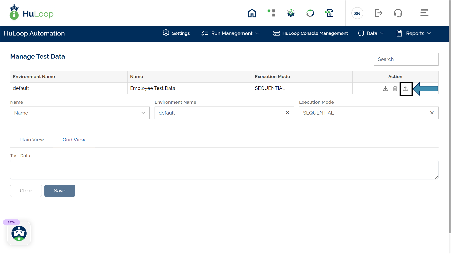 - After a successful upload, verify the test data in Plain View or Grid View by clicking the Test Data name.