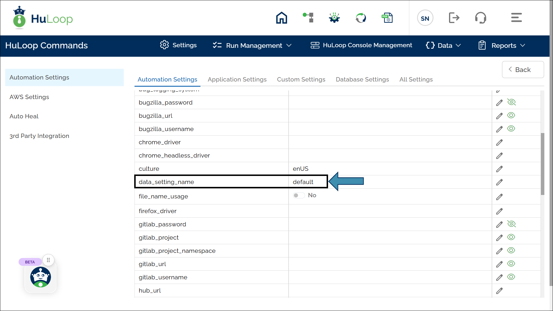 - Locate data_setting_name in the list.
