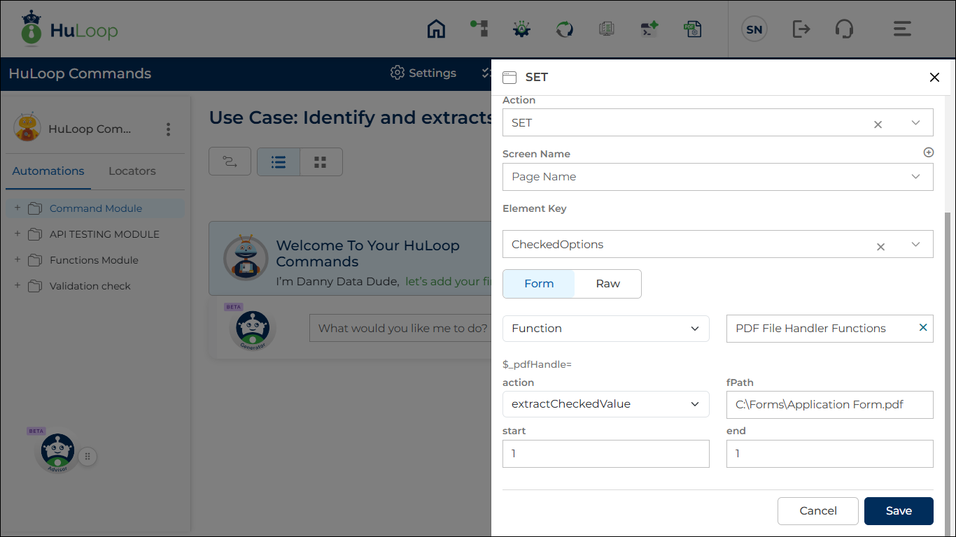The extractCheckedValue is an action under the PDF File Handler function. It identifies and extracts information related to checked checkboxes in a PDF file. It captures the total number of checked checkboxes and the associated text (such as the checkbox title or label) and stores this information in a variable for use in later steps.