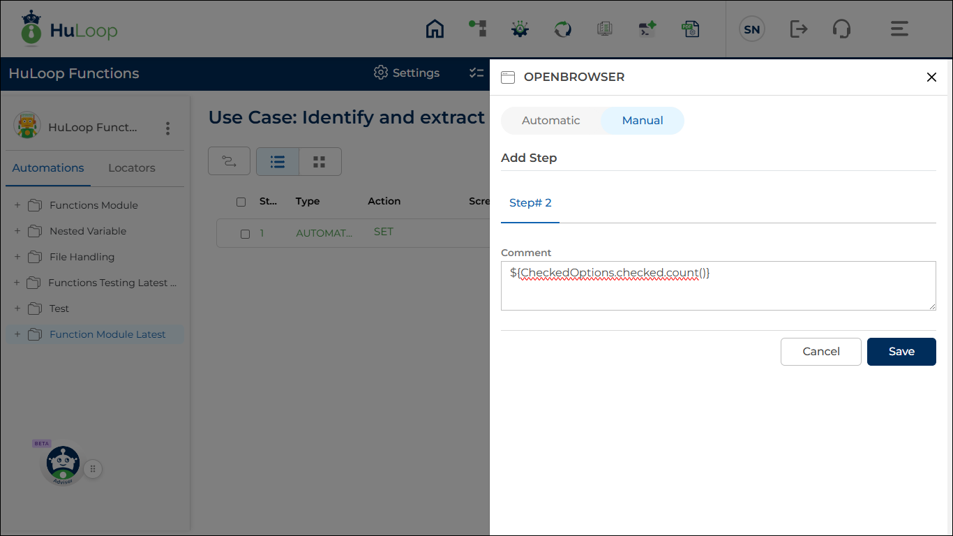 - In the Comment box, enter: ${CheckedOptions.checked.count()} where, CheckedOptions is the variable you defined in the Element Key field.
