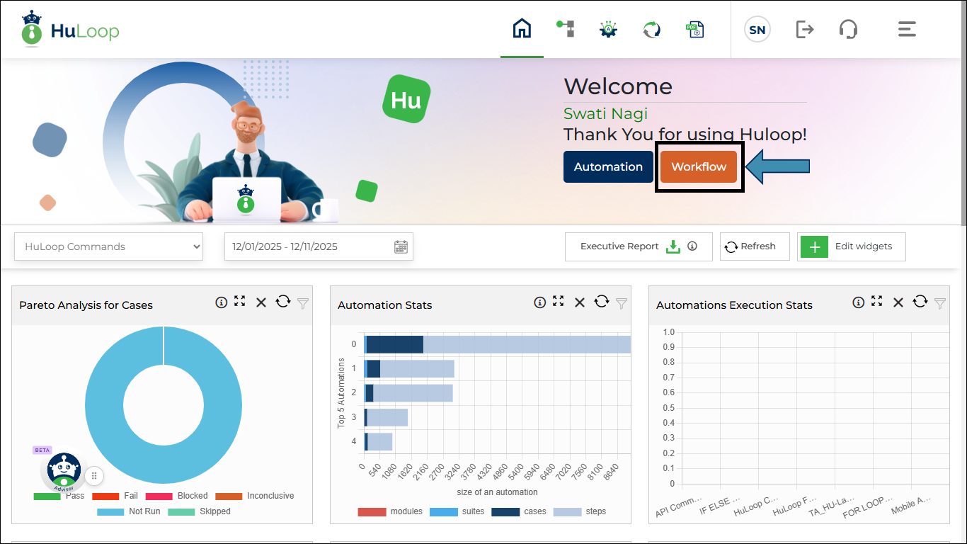 The Workflow module is accessible from the HuLoop homepage. You can use it to view your assigned workflows, create new ones, or manage user groups for task assignments.