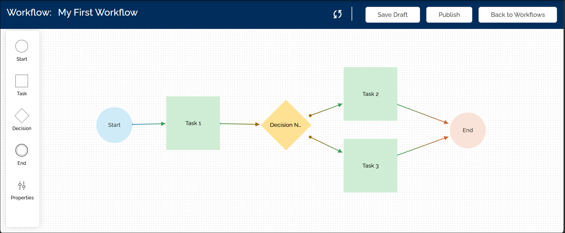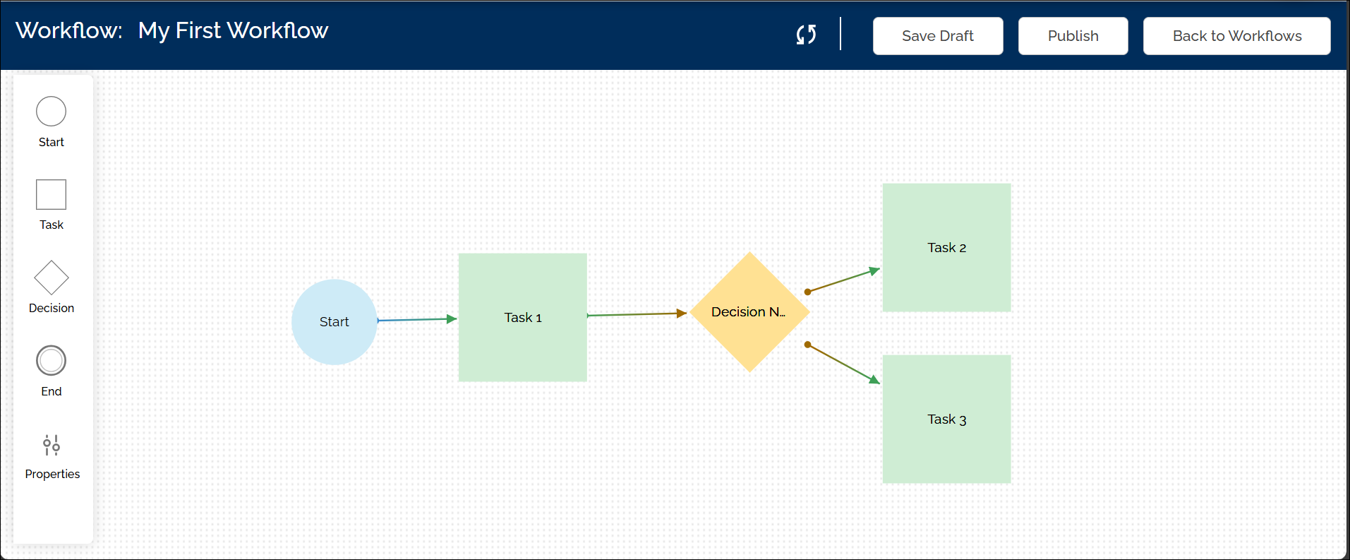 Once you have configured the Start node, you can begin designing the logic of your workflow by adding Task and Decision elements to the canvas.