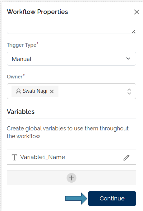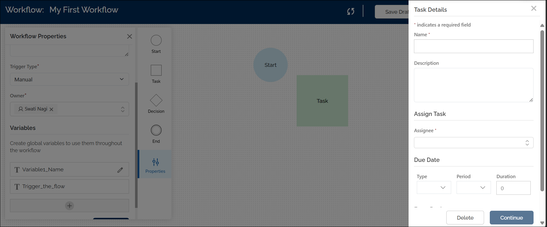 - Once all the required fields are filled, the Continue button becomes enabled. Click Continue to proceed to the canvas and begin configuring other workflow elements.