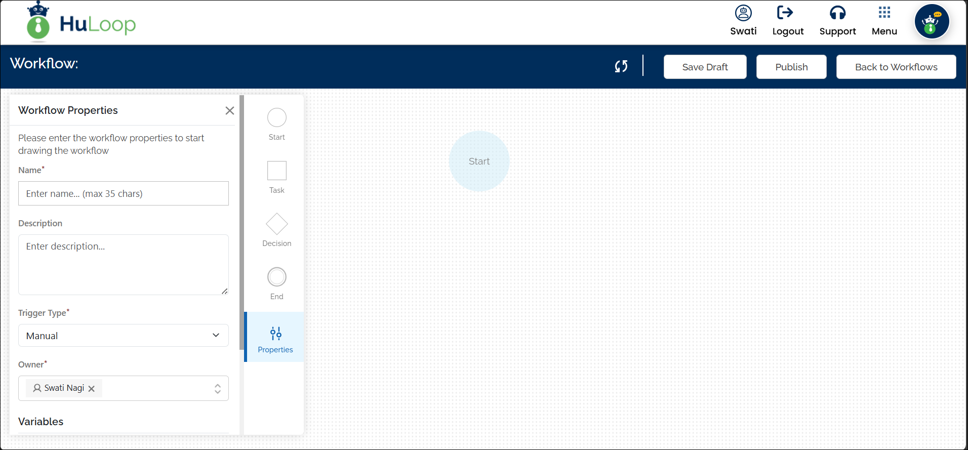 - Variables: You can define global workflow variables here, which are used to pass data between tasks and decisions. If preferred, you can also create global variables later while configuring individual tasks.