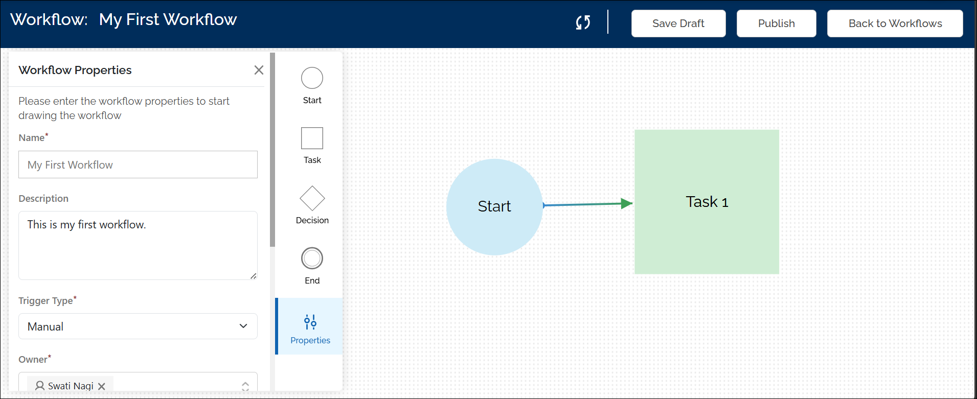 - Owner: This field is automatically populated with the name of the user creating the workflow (the Creator). The Creator can change the Owner by selecting a different user from the dropdown list, if needed.