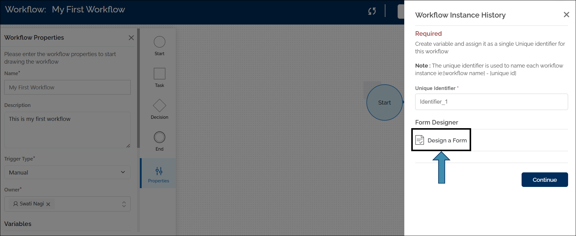 After defining a Start Variable, you can optionally configure a Start Form using the Design a Form option. This form appears at the time of workflow initiation and is completed by the user who starts the workflow.