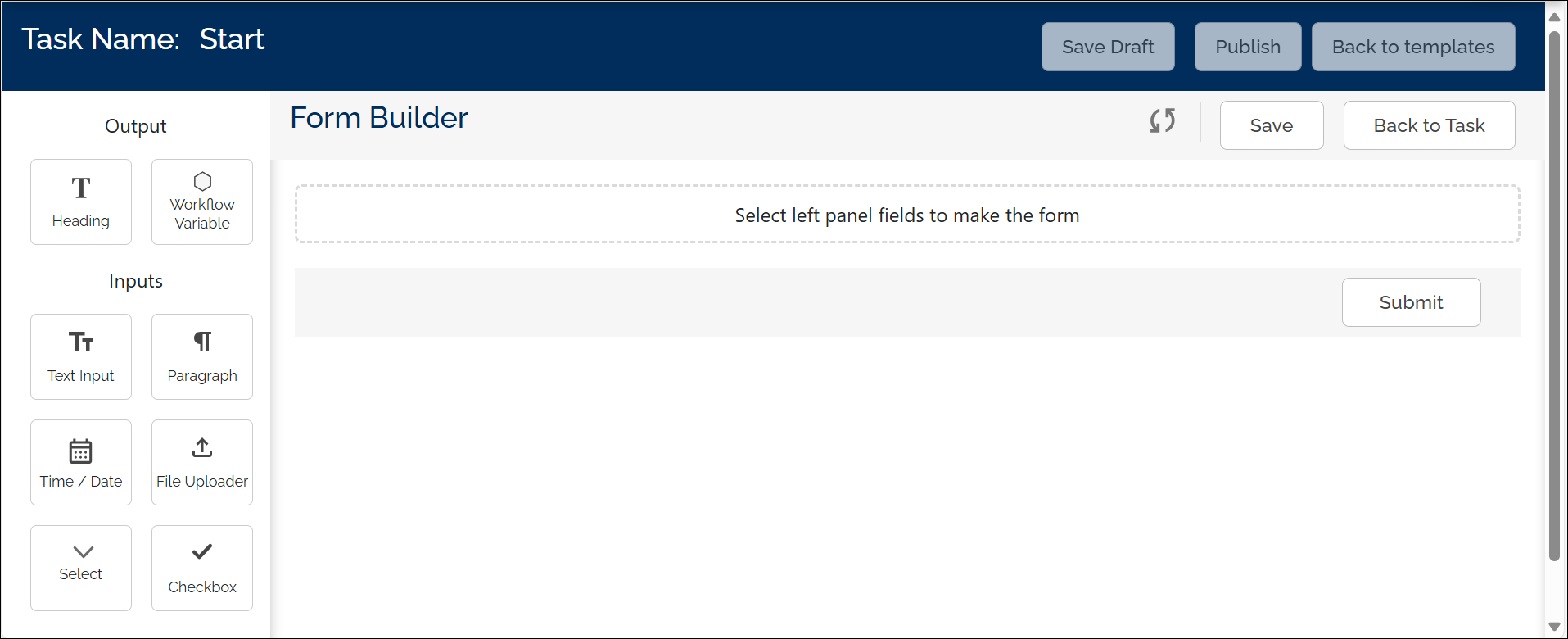 - Once the Start Form is designed, click Back to Task to return to the workflow canvas and continue designing the flow.