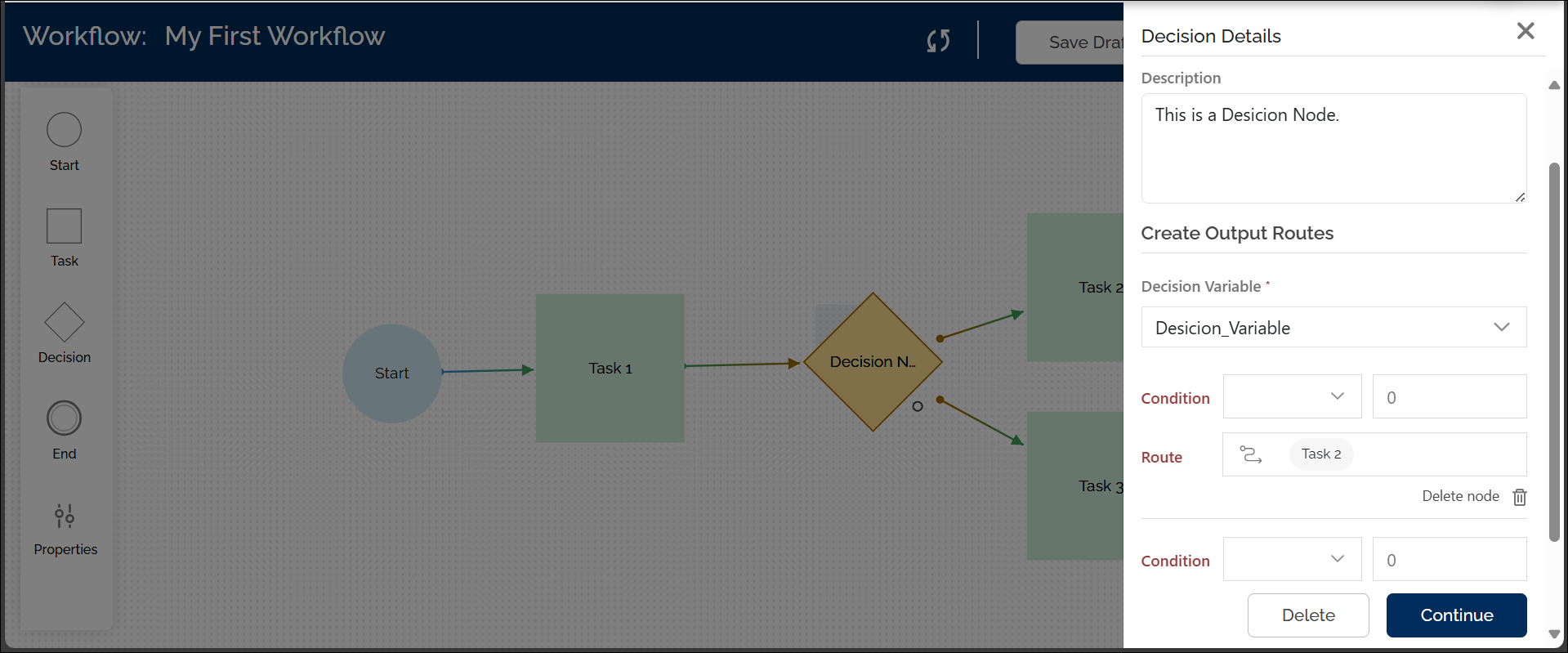 - Canvas (center): This is your visual workspace for designing workflows using Start, Task, Decision, and End nodes.