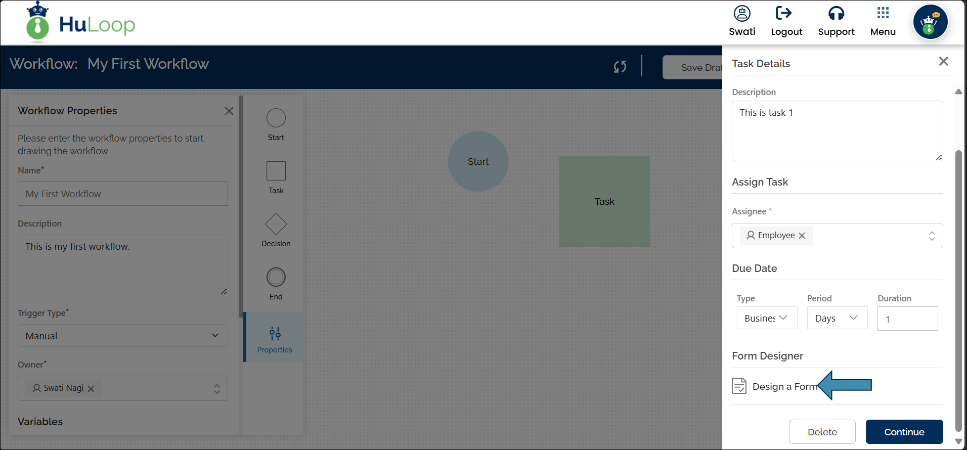 Creating a workflow in HuLoop is a simple, step-by-step process. Let’s walk through how to build a basic workflow using the visual designer, from initial setup to task assignment and conditional routing.
