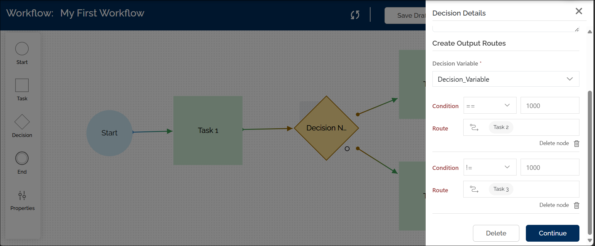 After adding a Decision node, define the task that should follow based on the decision logic. To configure decision logic: