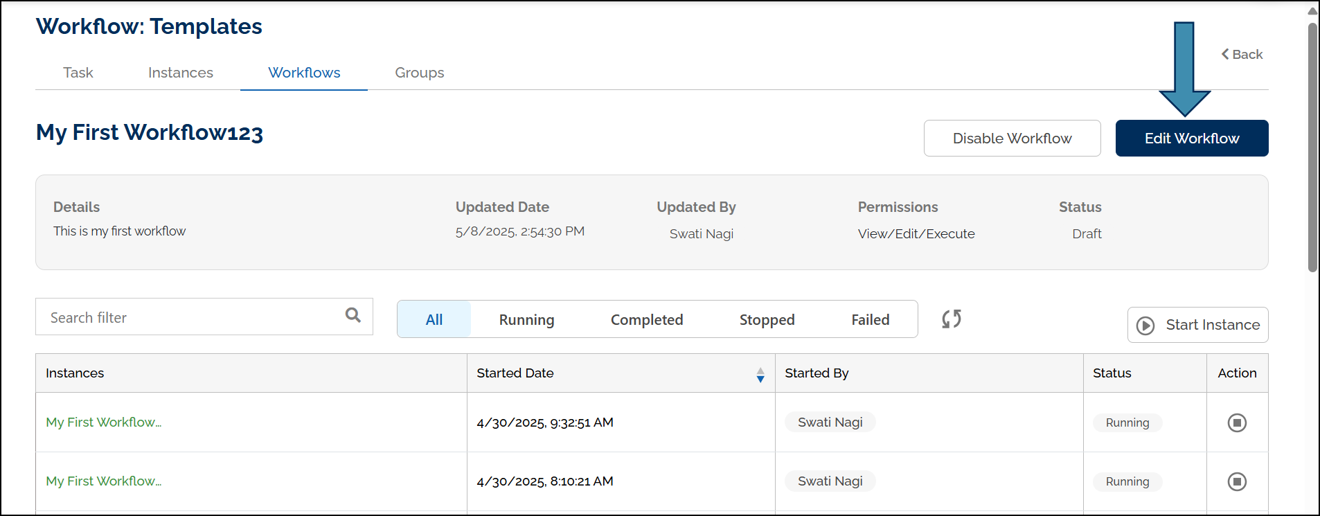 Workflows can be edited by users with the appropriate permissions (Creator, Owner, or Admin). Whether in Draft or Published status, workflows can be updated and republished as needed.