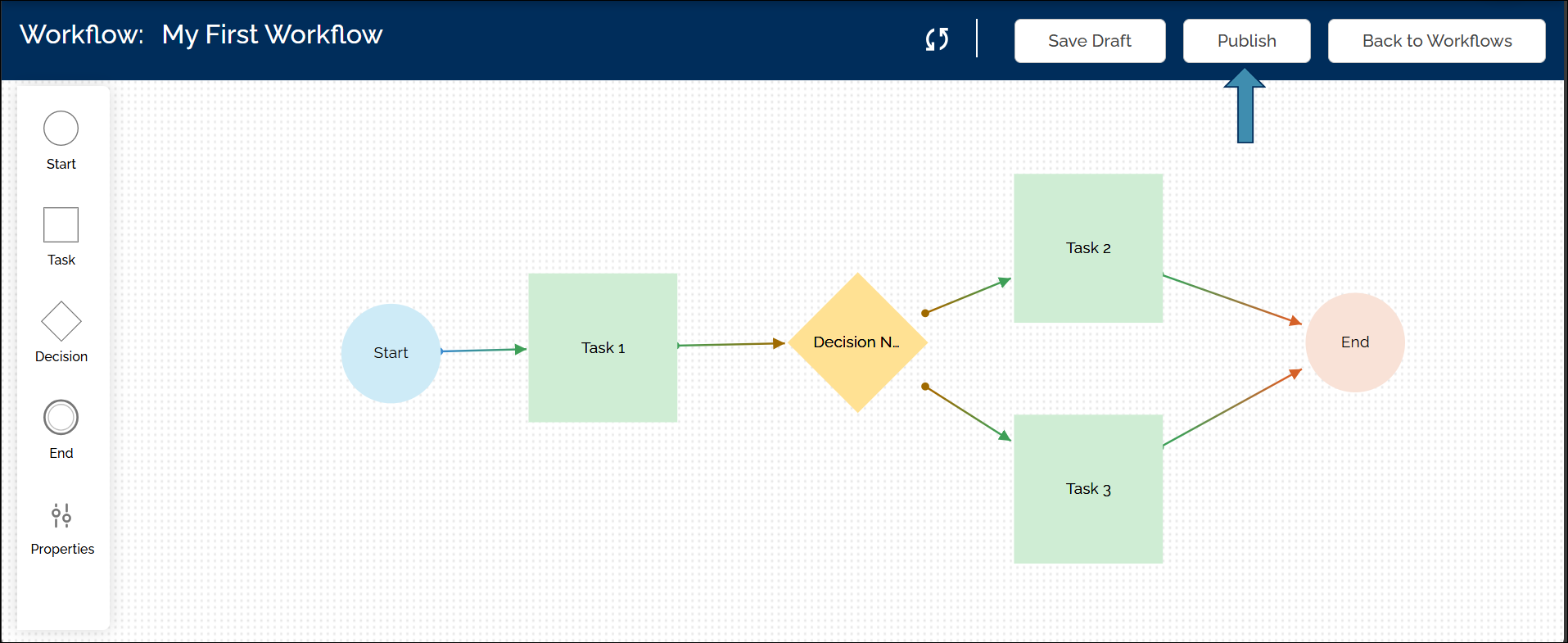 Note: Any changes you make to a workflow will only apply to new workflow instances started after the workflow is published. Instances already in progress will continue based on the version that was active when they started.