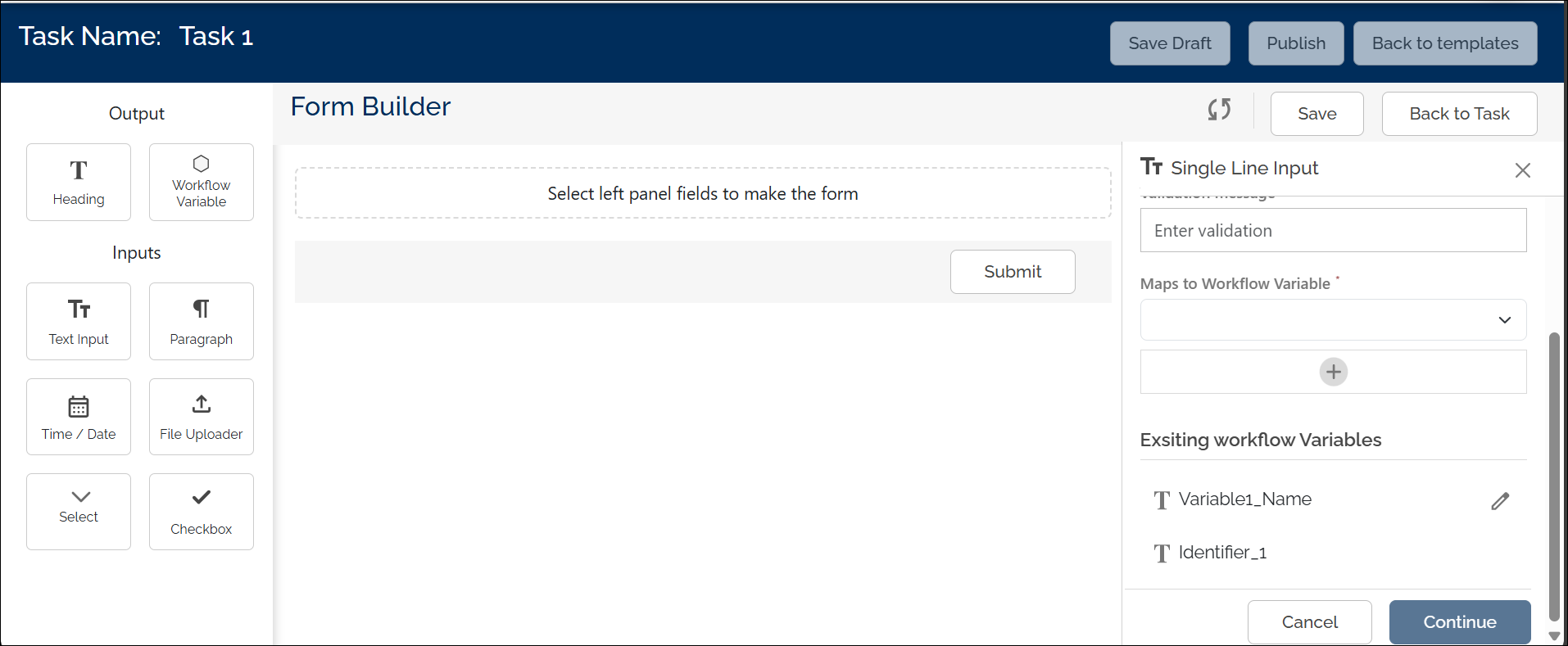 Every input and output field (except the Heading field) must be mapped to a workflow variable. This ensures that the values entered or displayed in the form are properly stored and used throughout the workflow.