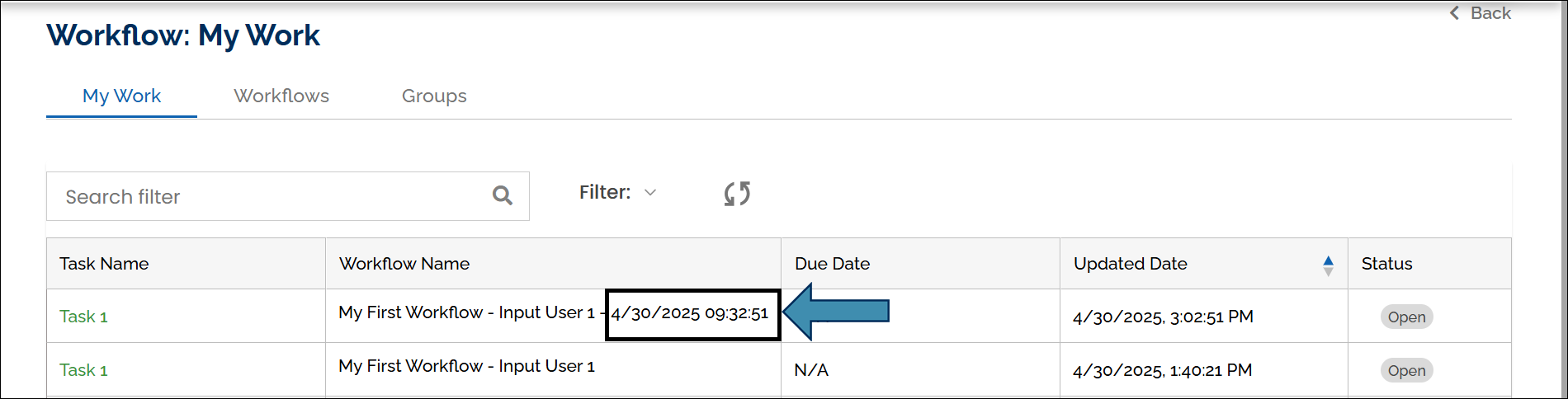 You can sort the Updated Date column on the Workflows page in ascending or descending order using the arrow icons in the column header.