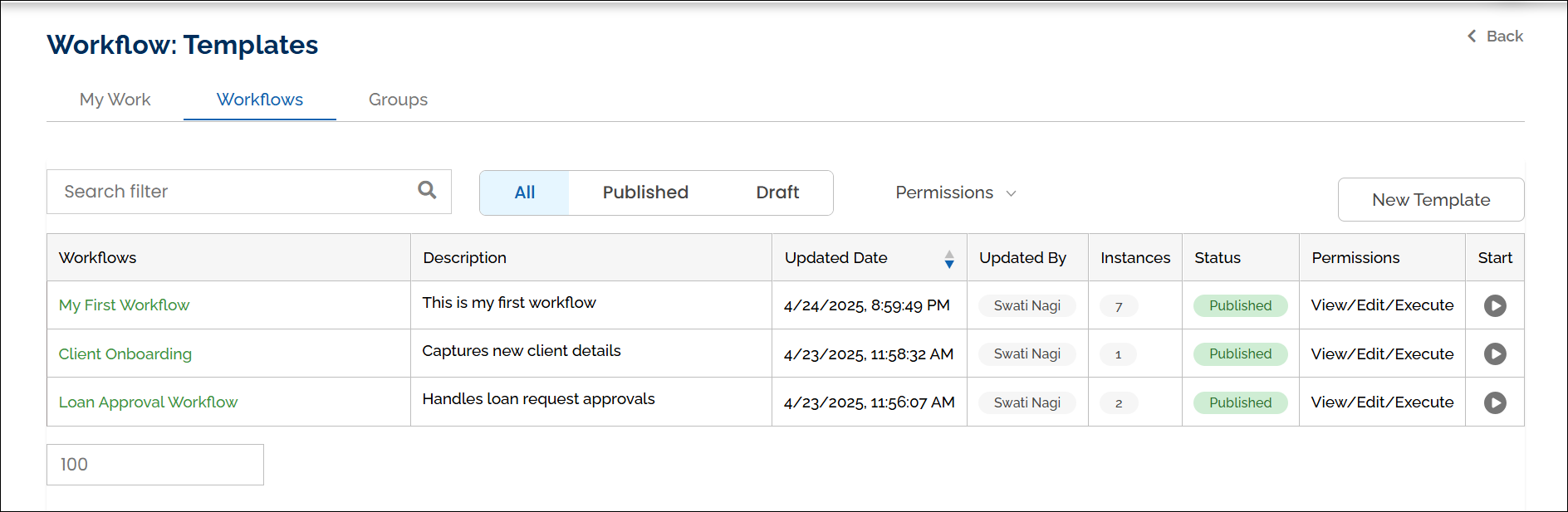 Each time you publish a workflow, a new version (instance) is created. This ensures the current version remains available for execution, and any changes do not affect workflows that are already running.